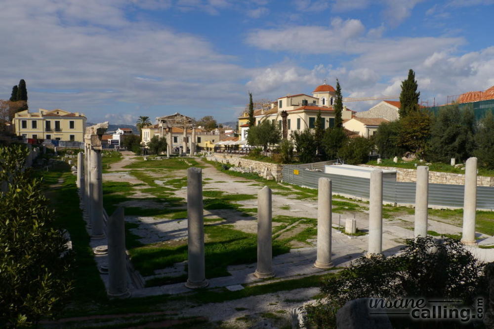 Several other ruins such as Roman Agora, Tower of Winds, Hadrian’s Library dot the base of the Acropolis hill. There is little remaining of them except some foundation stones, walls and a couple of impressive and enormous pillars. The Roman Agora replaced the Ancient Agora as commercial and administrative centre from the 3rd to the 19th century. The Tower of Winds was built by a Macedonian astronomer. It used to have a weather-vane to indicate the direction of the wind. It also housed a water clock which was operated by water flowing down from the Acropolis. Hadrian’s Library got its name from the Roman emperor Hadrian who donated it to the city. The central courtyard of the Hadrian’s Library houses an unusal church. It’s a so called tetraconch church, where the basic groundplan follows that of Greek cross. Today only the arched foundations and some pillars remain standing.
