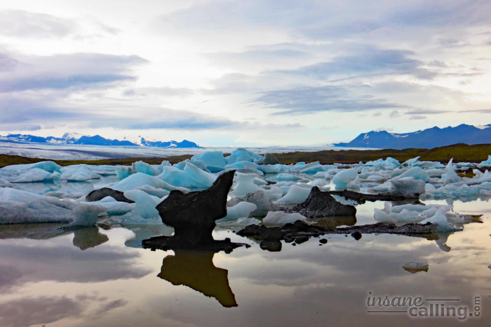 Here is my i.e. an amateur’s understanding of the geography behind it. Vatnajökull is a glacier located on a mountainous area. The massive sheet of ice can be a kilometer deep in certain areas and sits on top of several volcanoes. Picture an overflowing, old, beaten bucket of water. The water is the glacier and the bucket is the mountain range. In a way, the mountains contain the glacier but in some areas such as gaps between the mountains, the glacier “leaks out” forming “outlet glaciers” or “glacier tongues”. One such tongue is the Breiðamerkurjökull glacier. Jökulsárlón is the lake formed by melting and retreating of this “tongue”. As the glacier tongue melts, the lake increases in size. So you can stand at the edges of the lake and see the glacial tongue in the background. Large chunks of ice that have broken off from the glacier float in the lake and drift slowly towards the ocean.